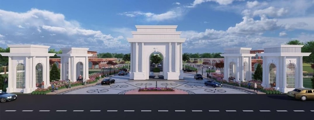 Grand gated township with modern amenities, lush landscapes, iconic entrance, and prime Mohanlalganj, Lucknow location.