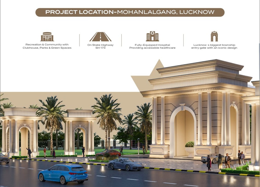 Iconic township in Mohanlalganj with grand entry gate, parks, clubhouse, hospital, and highway connectivity.